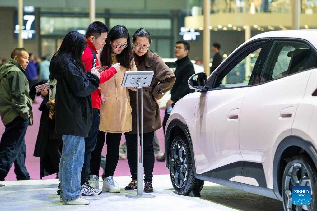 Visitors learn about a car at the 20th China (Changsha) International Automobile Exposition in Changsha, central China's Hunan Province, Dec. 4, 2024. The 6-day exposition, with an exhibition area of 120,000 square meters, kicked off on Wednesday at the Changsha International Convention and Exhibition Center, showcasing more than 1,000 vehicles from over 80 automobile brands. (Xinhua/Chen Sihan)