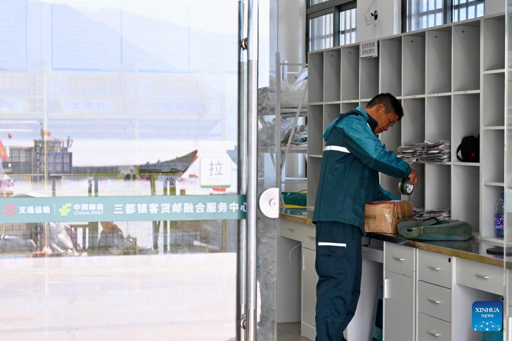 Shi Jinquan packs parcels at a postal service center of Sandu Town, Ningde City, southeast China's Fujian Province, Dec. 2, 2024. (Xinhua/Jiang Kehong)