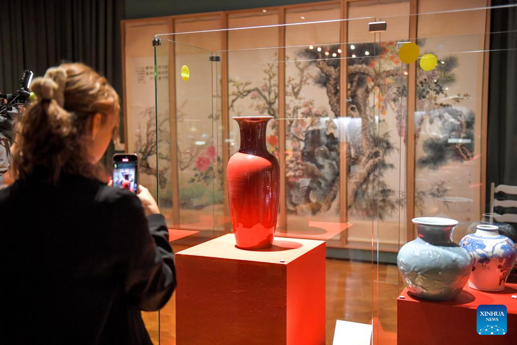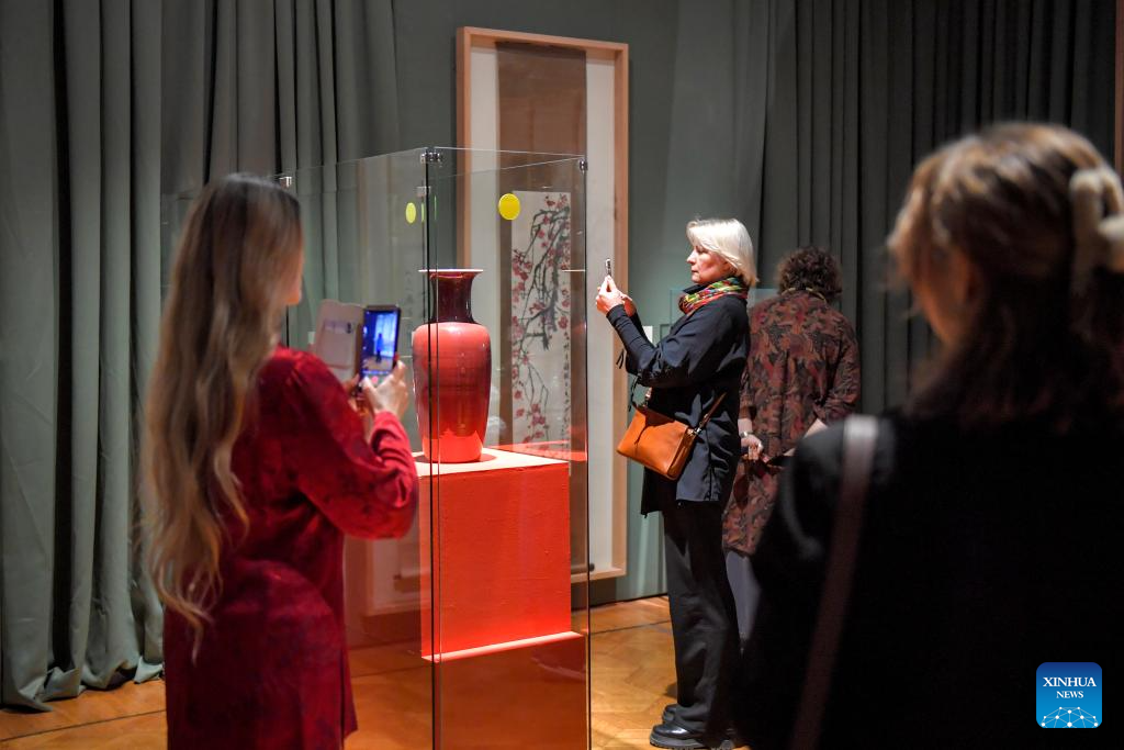 Visitors take photos of exhibits at an exhibition of Chinese art at the State Museum of Oriental Art in Moscow, capital of Russia, on Dec. 4, 2024. (Photo by Alexander Zemlianichenko Jr/Xinhua)