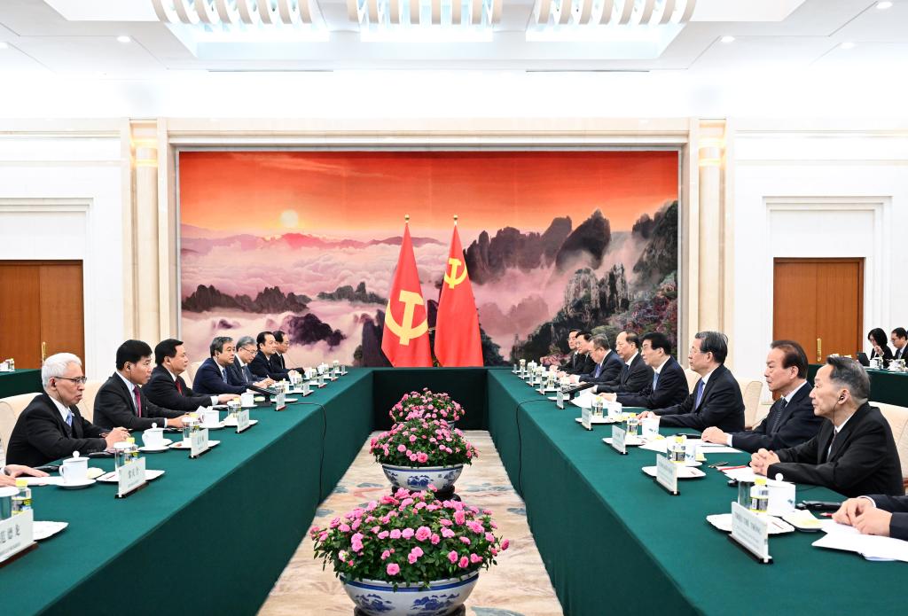 Wang Huning, a member of the Standing Committee of the Political Bureau of the Communist Party of China Central Committee and chairman of the National Committee of the Chinese People's Political Consultative Conference, meets with a Communist Party of Vietnam (CPV) delegation led by Nguyen Xuan Thang, a member of the Politburo of the CPV Central Committee, president of the Ho Chi Minh National Academy of Politics and chairman of the Central Theoretical Council, in Beijing, capital of China, Dec. 5, 2024. (Xinhua/Rao Aimin)