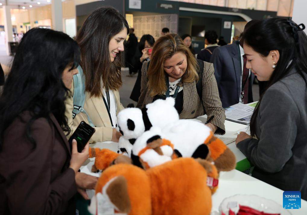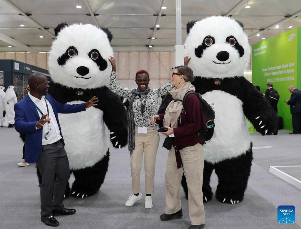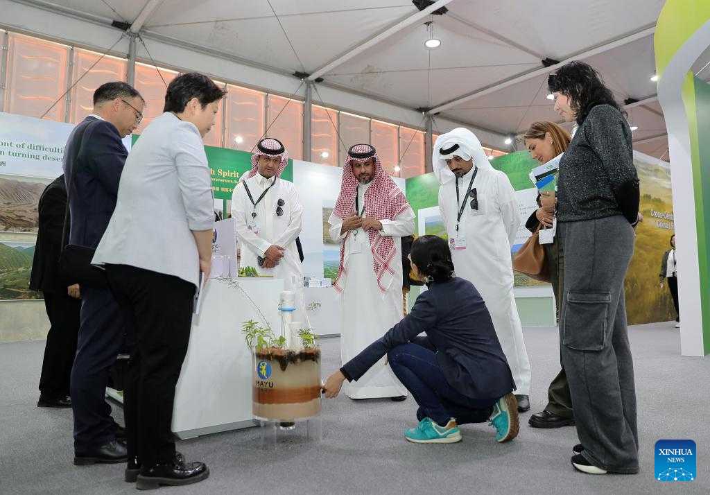 People visit the China Pavilion during the 16th Conference of the Parties (COP16) to the United Nations Convention to Combat Desertification (UNCCD) in Riyadh, Saudi Arabia, on Dec. 2, 2024. Covering more than 600 square meters, the China Pavilion is the second-largest national pavilion at the event. Its exhibition, themed "Cross-Century Green Great Wall, China's Restoration in Action," showcases the nation's battle against desertification, particularly through the Three-North Shelter Forest Program, a major national initiative aimed at reversing land desertification. (Xinhua/Wang Dongzhen)