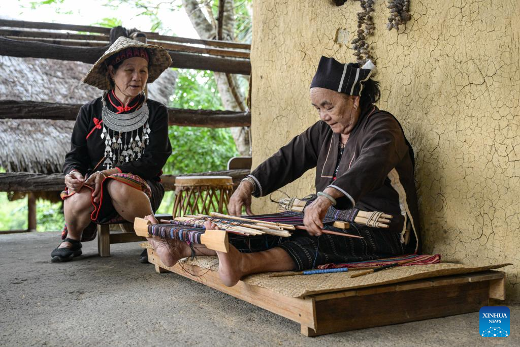 An elderly woman of Li ethnic group demonstrates Li brocade weaving techniques at Binglanggu tourism area in Baoting Li and Miao Autonomous County, south China's Hainan Province, Nov. 4, 2024.?(Xinhua/Pu Xiaoxu)