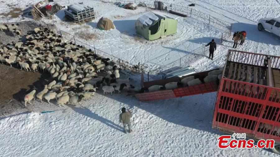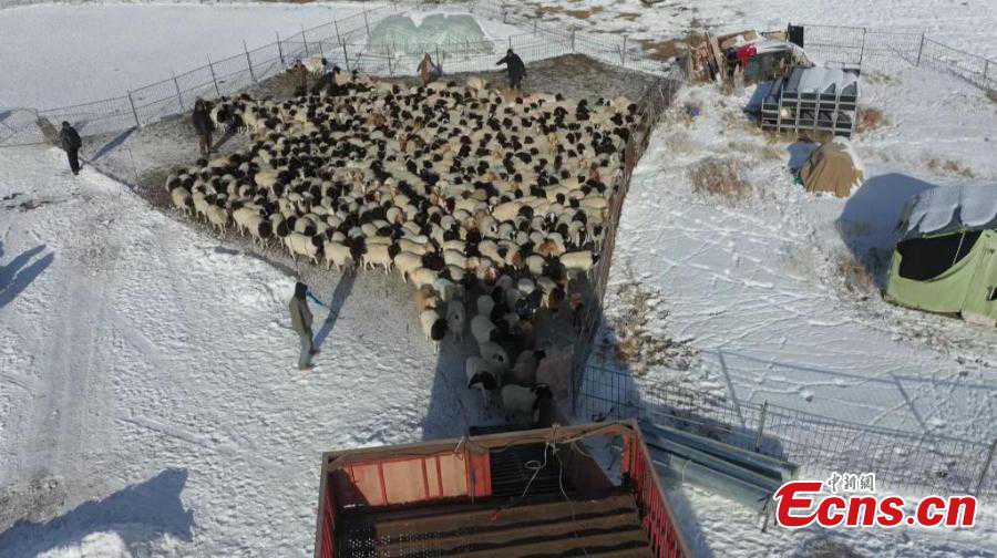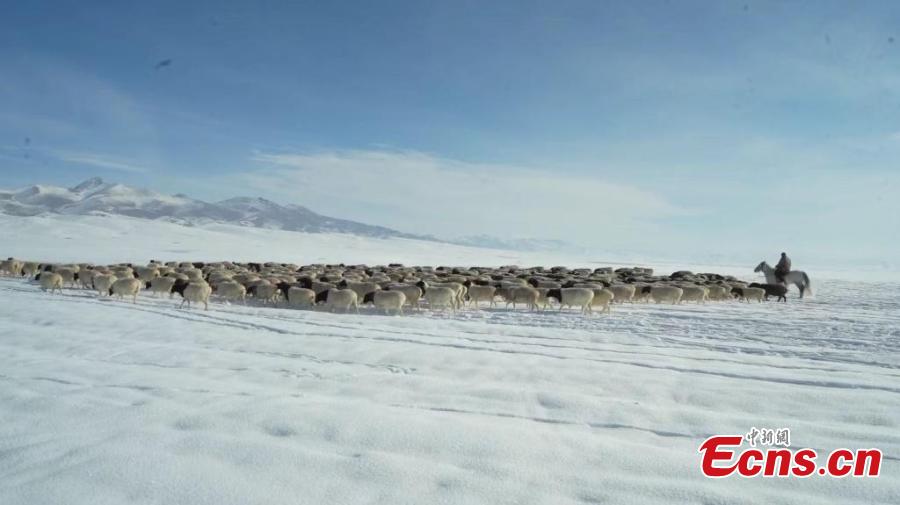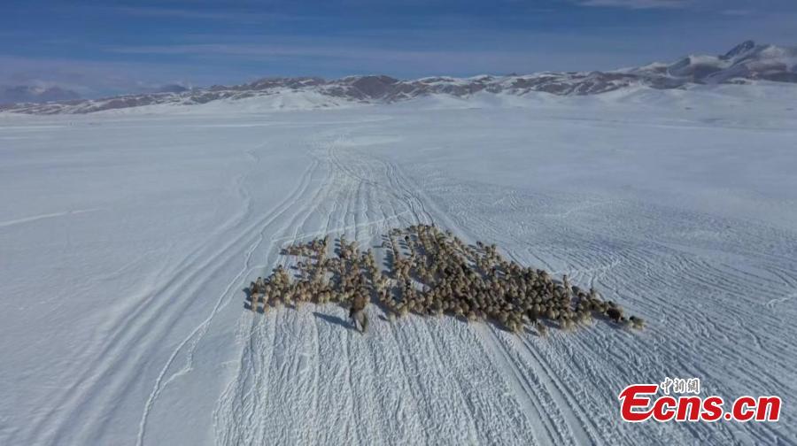 Herders drive livestock on the way to winter pastures on Bayanbulak Grassland in Hejing County, northwest China's Xinjiang Uygur Autonomous Region. (China News Service/Gao Naqing)