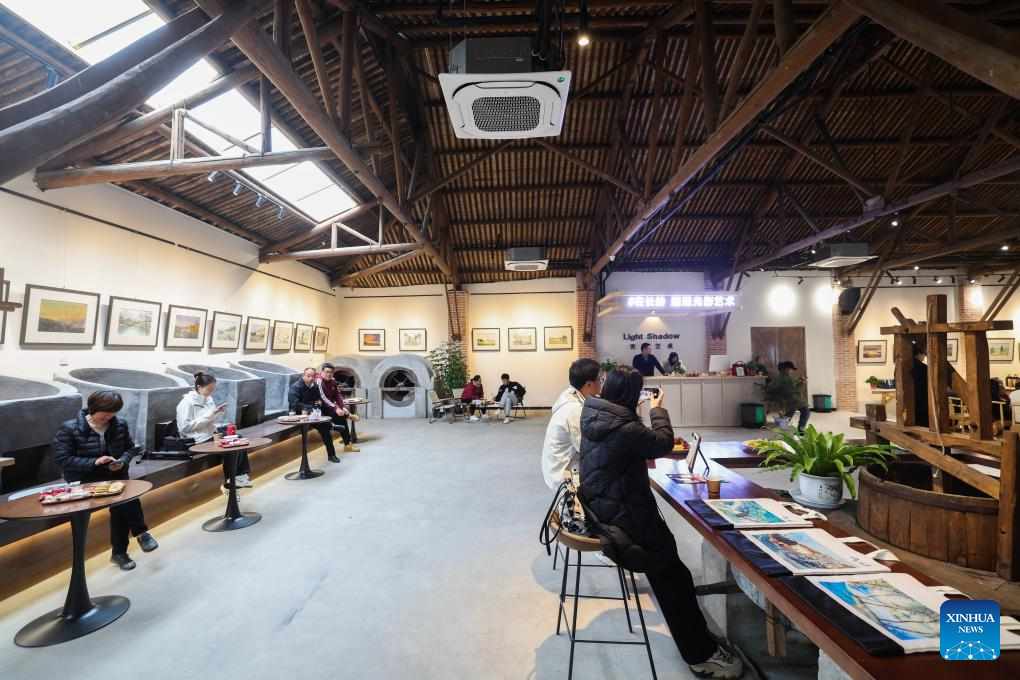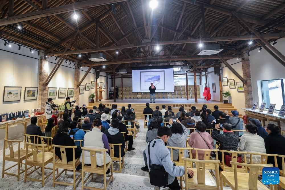 People have a leisure time at the Changling Hill art space in Changling Village of Jiande City in east China's Zhejiang Province, Dec. 6, 2024. An art exhibition, presenting more than 50 rural-themed watercolor paintings, opened in Changling Village on Friday.