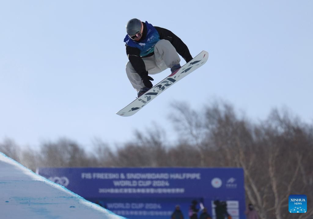 Gao Hongbo of China competes during the men's qualification of FIS Snowboard Halfpipe World Cup 2024 in Zhangjiakou, north China's Hebei Province, Dec. 6, 2024. (Xinhua/Luo Yuan)