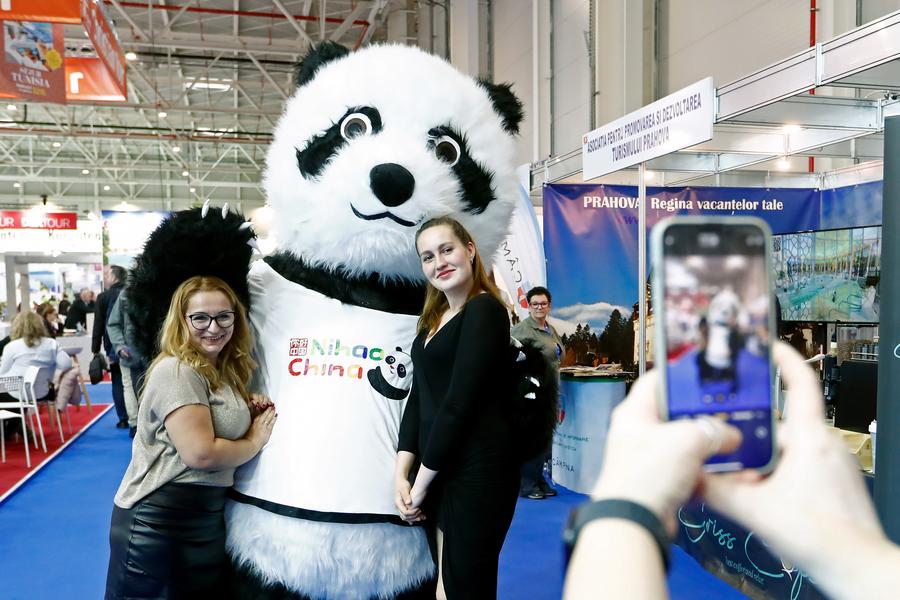Visitors pose for photos with a giant panda mascot of China's stand at the autumn edition of Romania's Tourism Fair in Bucharest, Romania, Nov. 22, 2024. China's stand attracted visitors at the Romania's Tourism Fair, which is held here from Nov. 21-24, as China has expanded its visa-free policy to nine additional countries including Romania, allowing their citizens to enter for up to 30 days without a visa for business, tourism, and other visits starting Nov. 30, 2024. (Photo by Cristian Cristel/Xinhua)