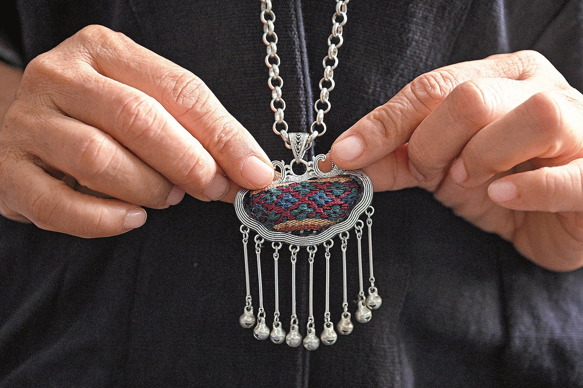 A Li ethnic woman displays a pendant made with traditional Li textile techniques in Dongfang, Hainan province. (Pu Xiaoxu/Xinhua)