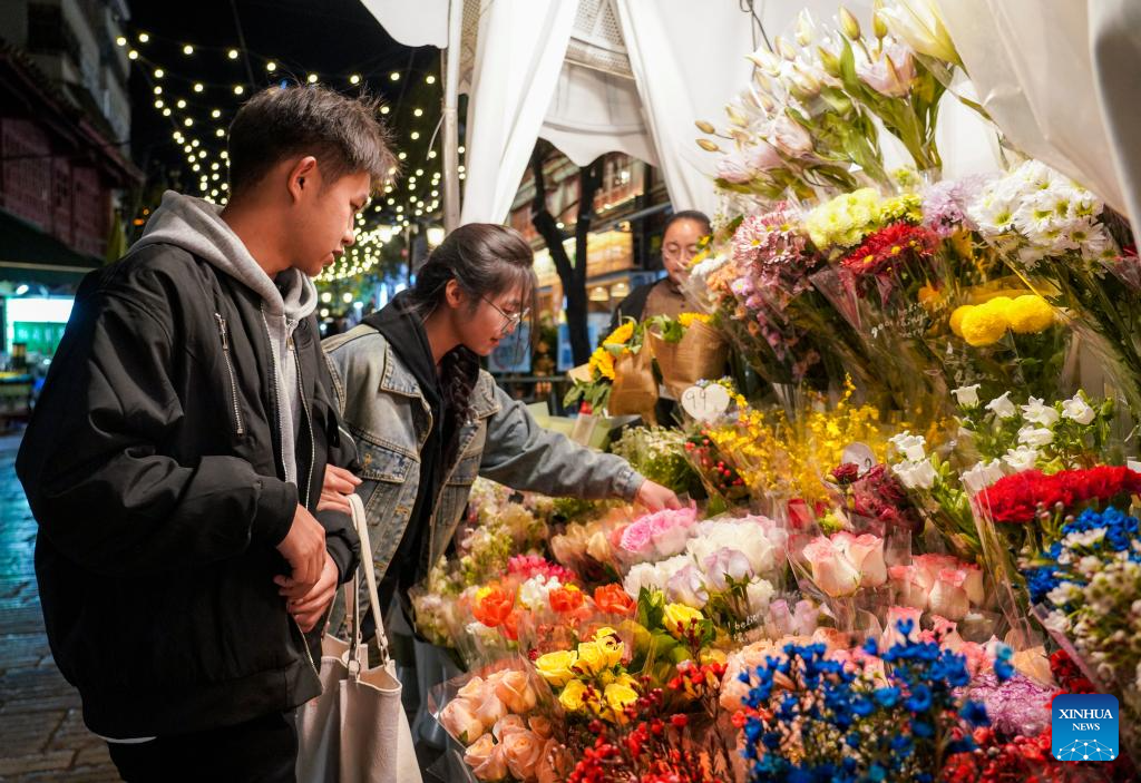 Tourists select flowers on a street at night in Kunming City, southwest China's Yunnan Province, Dec. 6, 2024. In recent years, Kunming has stepped up its efforts to enrich citizen's life by developing night fair compounds. (Xinhua/Wang Jingyi)