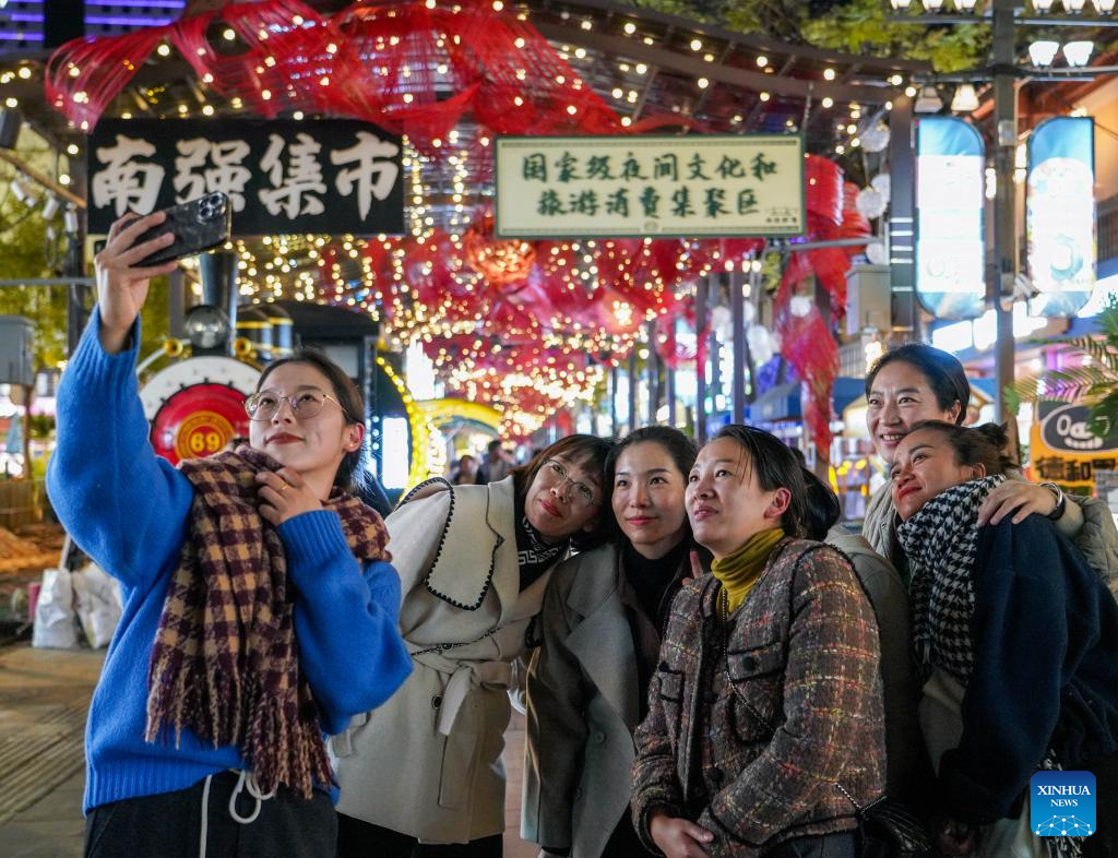 Tourists pose for a photo on a street at night in Kunming City, southwest China's Yunnan Province, Dec. 6, 2024. In recent years, Kunming has stepped up its efforts to enrich citizen's life by developing night fair compounds. (Xinhua/Wang Jingyi)