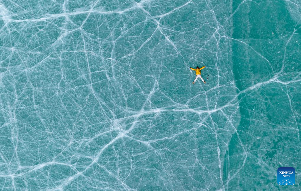 An aerial drone photo taken on Dec. 7, 2024 shows a tourist posing for photos on an icy lake in front of the Mount Qungmknag in Nyemo County of Lhasa, southwest China's Xizang Autonomous Region. (Xinhua/Tenzin Nyida)