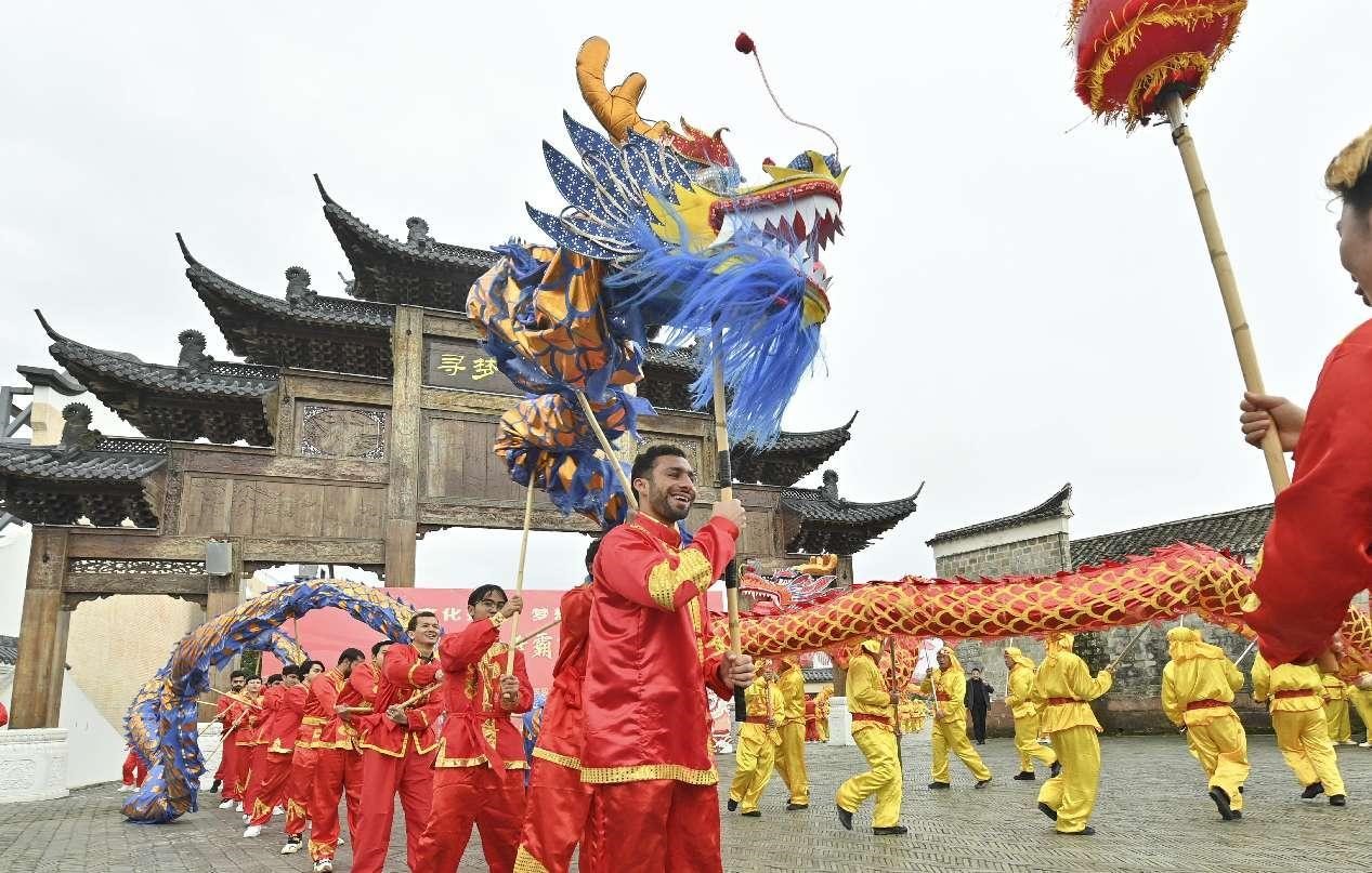 International students from Nanchang University enjoy dragon dance during the Spring Festival in Wenchangli historical area, Fuzhou, east China's Jiangxi province, February 13, 2024. (People's Daily Online/Li Jie)