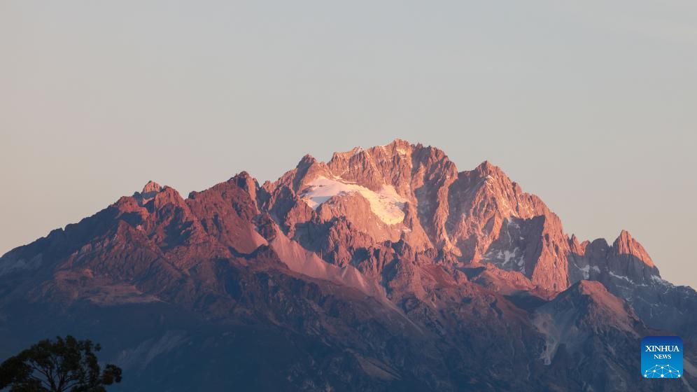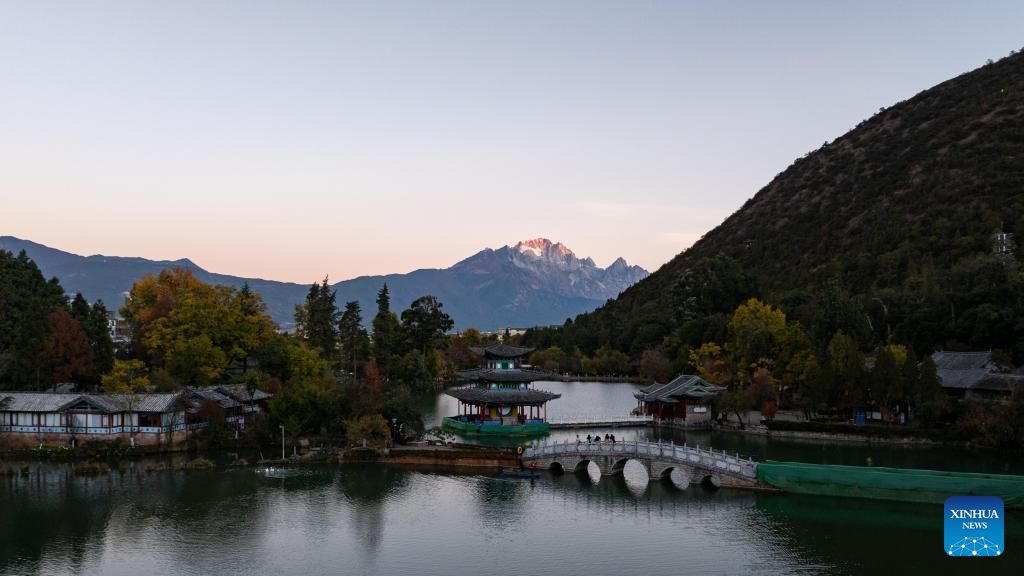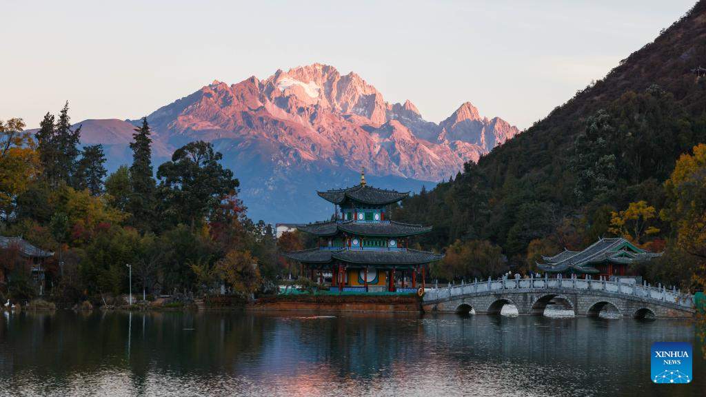 This photo taken from Heilongtan Park shows sunlight shining on the Yulong Snow Mountain in Lijiang City, southwest China's Yunnan Province, Dec. 9, 2024. (Xinhua/Meng Tao)