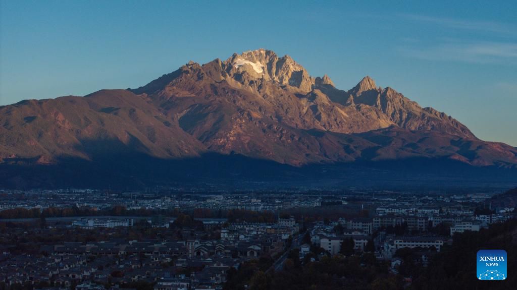 A drone photo taken from Heilongtan Park shows sunlight shining on the Yulong Snow Mountain in Lijiang City, southwest China's Yunnan Province, Dec. 9, 2024. (Xinhua/Meng Tao)
