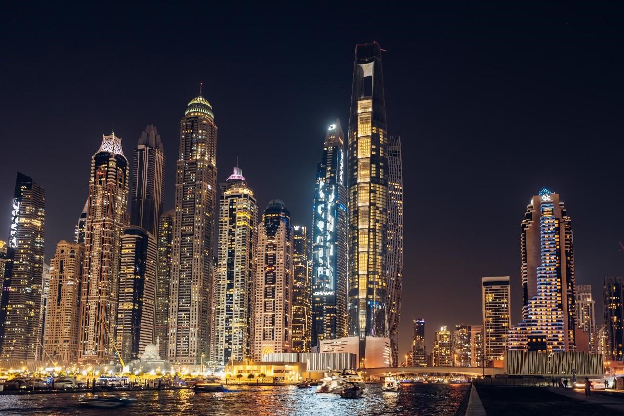 Photo shows a night view of the Marina district of Dubai, the UAE. (Photo courtesy of China Railway 18th Bureau Group)