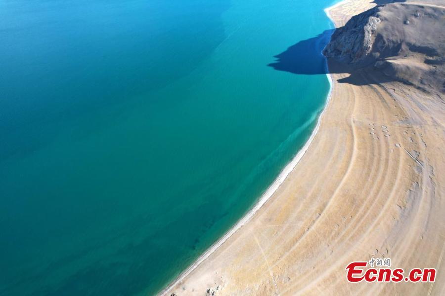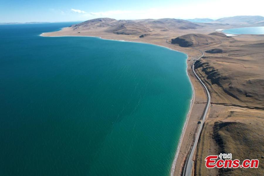 Aerial view of Serling Tso Lake in winter in Nagqu, southwest China's Xizang Autonomous Region, Dec. 9, 2024. (China News Service/Li Lin)
