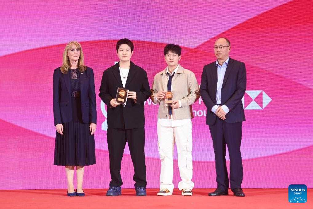 Liu Shengshu (2nd L) /Tan Ning (2nd R) of China take group photos at the annual awards ceremony during the BWF World Tour welcome banquet in Hangzhou, east China's Zhejiang Province, Dec. 9, 2024. (Xinhua/Huang Zongzhi)