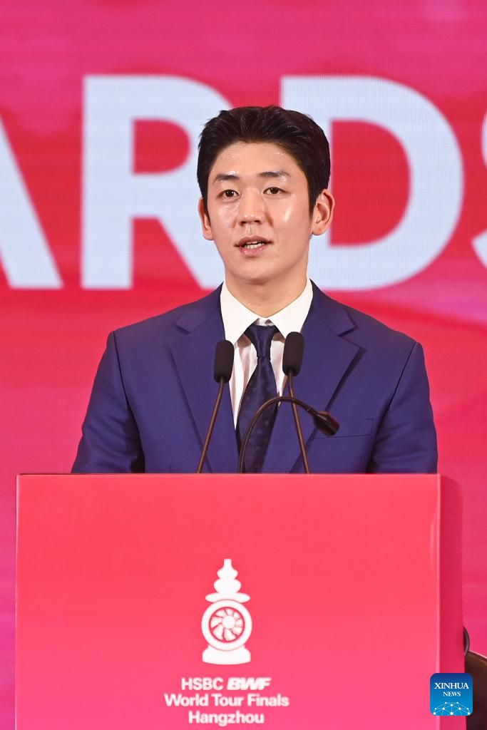 Chen Long of China makes a speech at the annual awards ceremony during the BWF World Tour welcome banquet in Hangzhou, east China's Zhejiang Province, Dec. 9, 2024. (Xinhua/Huang Zongzhi)
