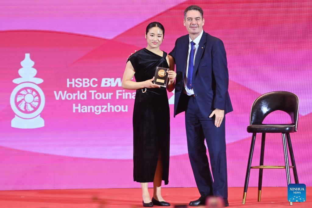 Shi Yuqi of China and BWF President Poul-Erik Hoyer Larsen take photos at the annual awards ceremony during the BWF World Tour welcome banquet in Hangzhou, east China's Zhejiang Province, Dec. 9, 2024. (Xinhua/Huang Zongzhi)