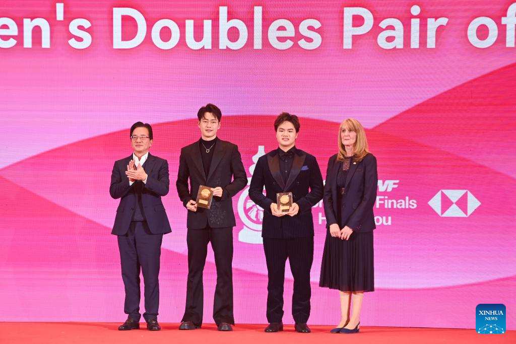 Liang Weikeng (2nd R) /Wang Chang (2nd L) of China take group photos at the annual awards ceremony during the BWF World Tour welcome banquet in Hangzhou, east China's Zhejiang Province, Dec. 9, 2024. (Xinhua/Huang Zongzhi)