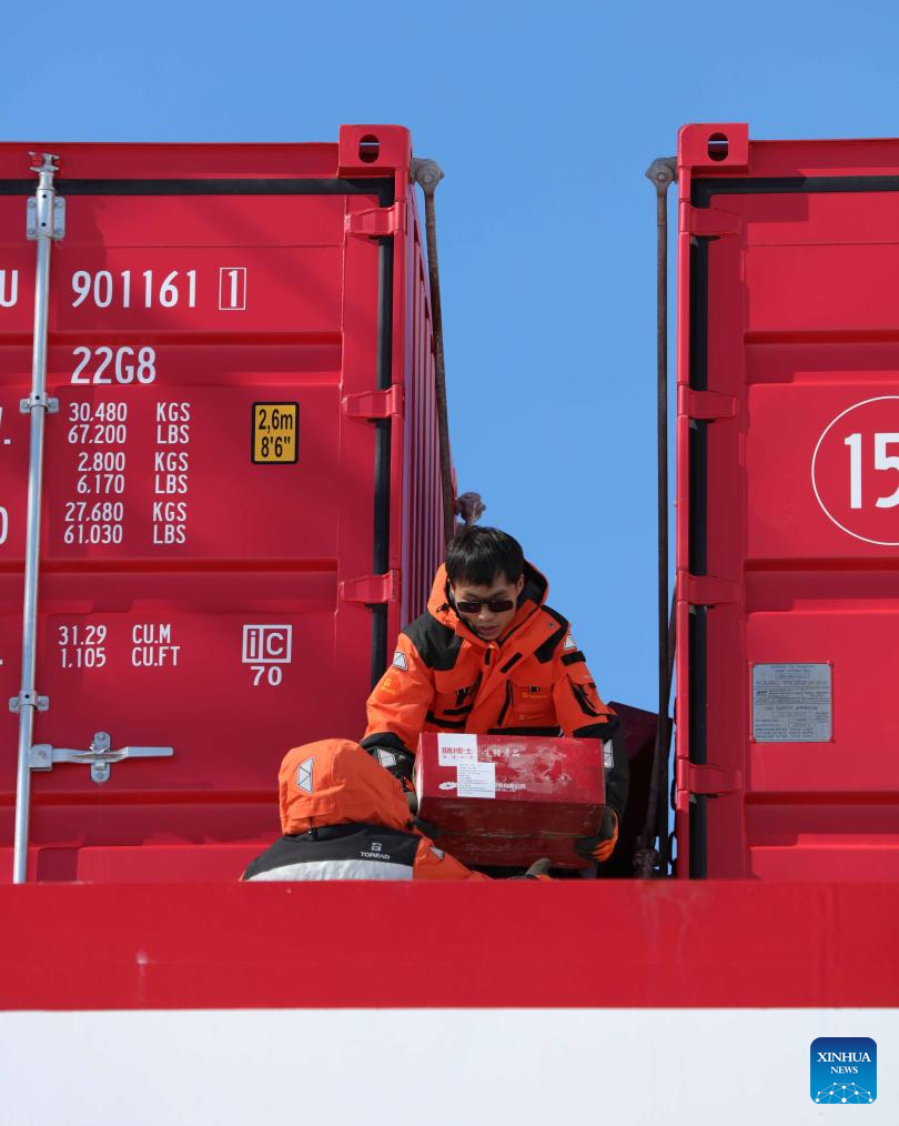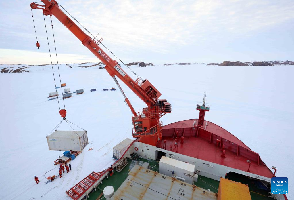Members of China's 41st Antarctic expedition team unload supplies in Antarctica, Dec. 9, 2024. Currently on China's 41st Antarctic expedition, research icebreakers Xuelong and Xuelong 2, or Snow Dragon and Snow Dragon 2, carried out unloading operations surrounding Zhongshan Station, a Chinese research base in Antarctica. (Xinhua/Huang Taoming)