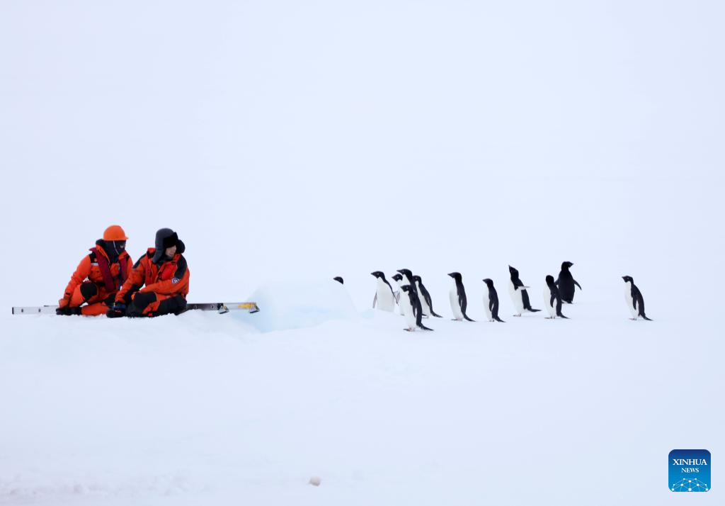 Members of China's 41st Antarctic expedition team and penguins are pictured in Antarctica, Dec. 8, 2024. Currently on China's 41st Antarctic expedition, research icebreakers Xuelong and Xuelong 2, or Snow Dragon and Snow Dragon 2, carried out unloading operations surrounding Zhongshan Station, a Chinese research base in Antarctica. (Xinhua/Huang Taoming)