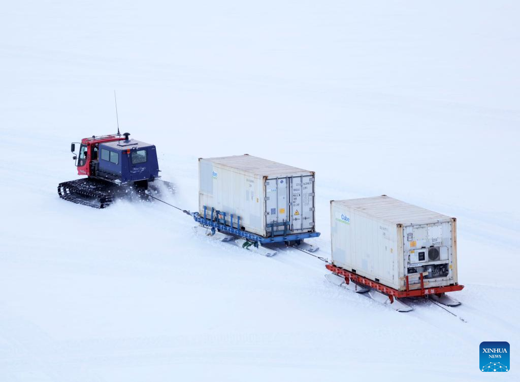 A snowmobile transports supplies to China's Zhongshan station in Antarctica, Dec. 9, 2024. Currently on China's 41st Antarctic expedition, research icebreakers Xuelong and Xuelong 2, or Snow Dragon and Snow Dragon 2, carried out unloading operations surrounding Zhongshan Station, a Chinese research base in Antarctica. (Xinhua/Huang Taoming)