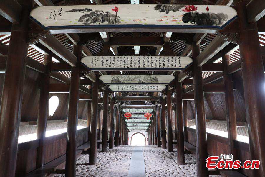 Photo taken on Dec. 11, 2024, shows paintings inside a wooden arcade bridge in Qingyuan County of Lishui, east China's Zhejiang Province. (China News Service/Fu Feiyang)