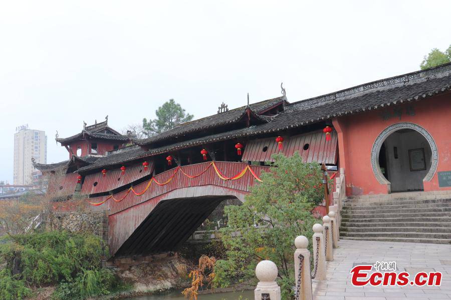 A view of Yonggui Bridge, a wooden arch bridge, in Qingyuan County of Lishui, east China's Zhejiang Province, Dec. 11, 2024. (China News Service/Fu Feiyang)