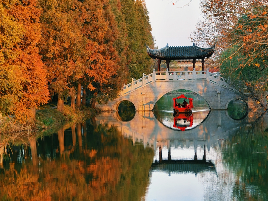 Layers of autumn colors surround Pearl Lake in the Nanshan Scenic Spot, Zhenjiang city, east China's Jiangsu Province. (Photo/Chen Jiang)