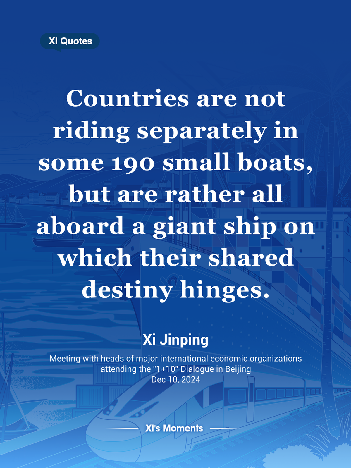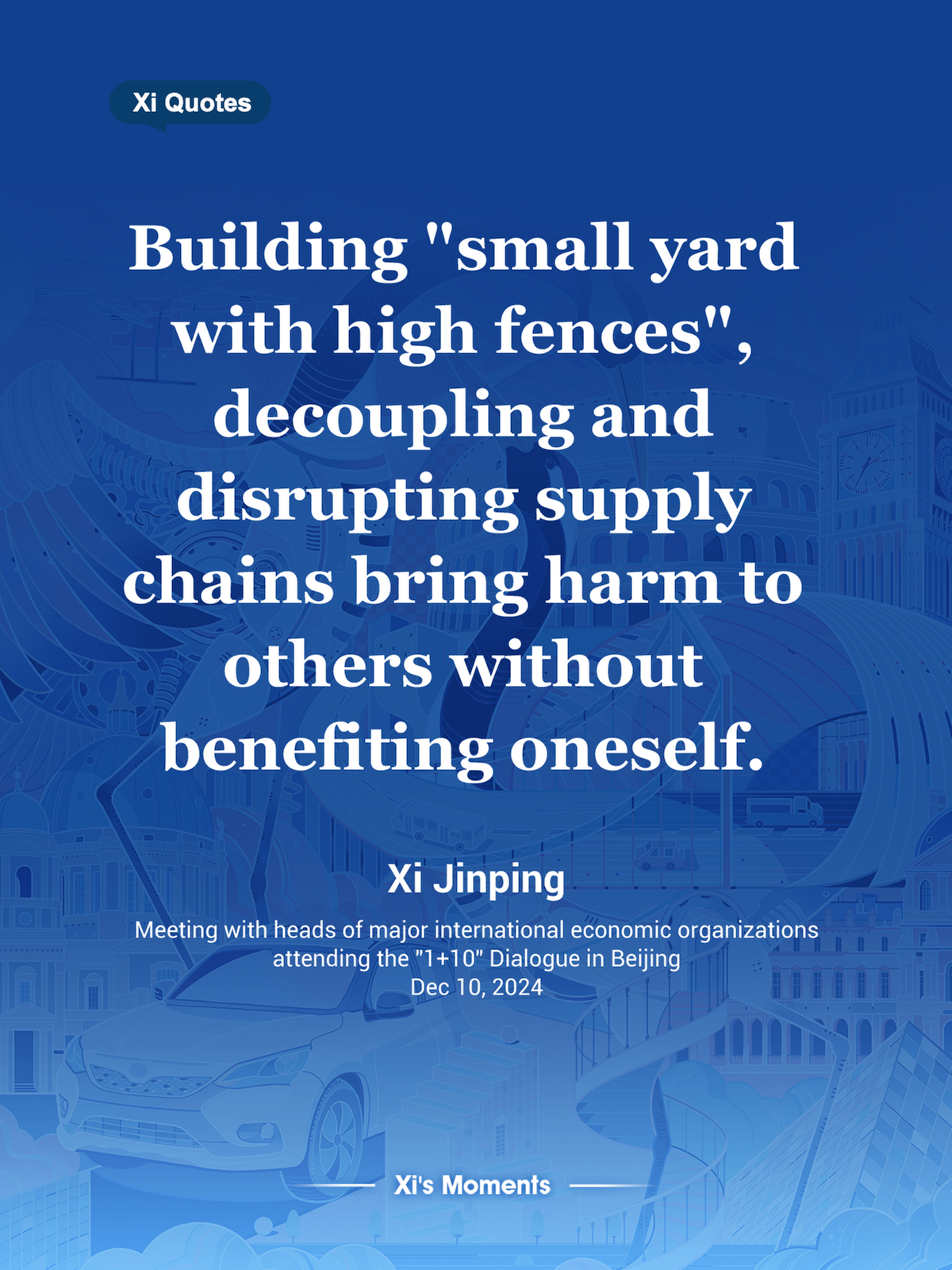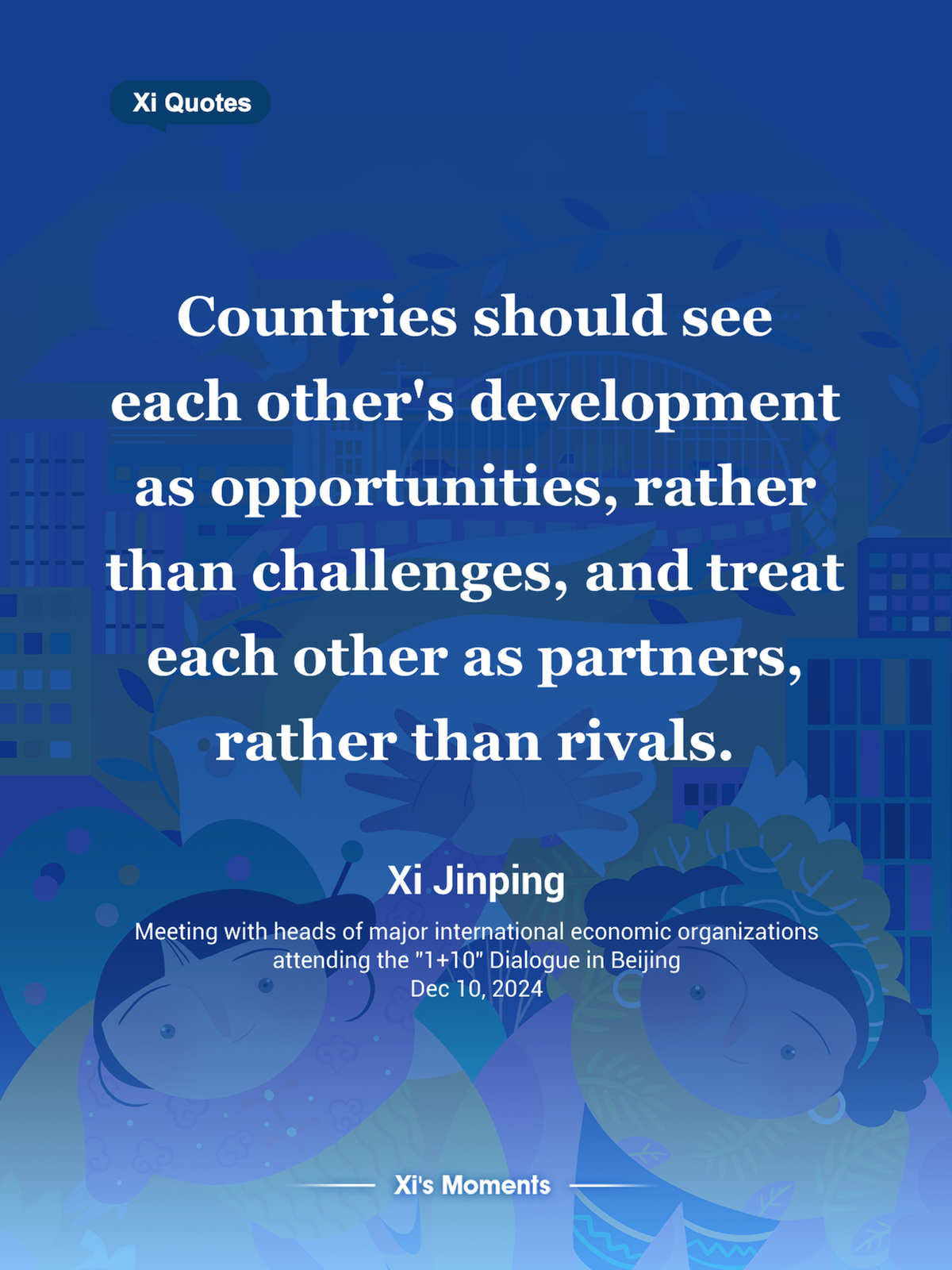 Meeting with heads of major international economic organizations in Beijing on Tuesday, President Xi Jinping stressed again the importance of building an open world economy through cooperation. Here are some highlights of his remarks.