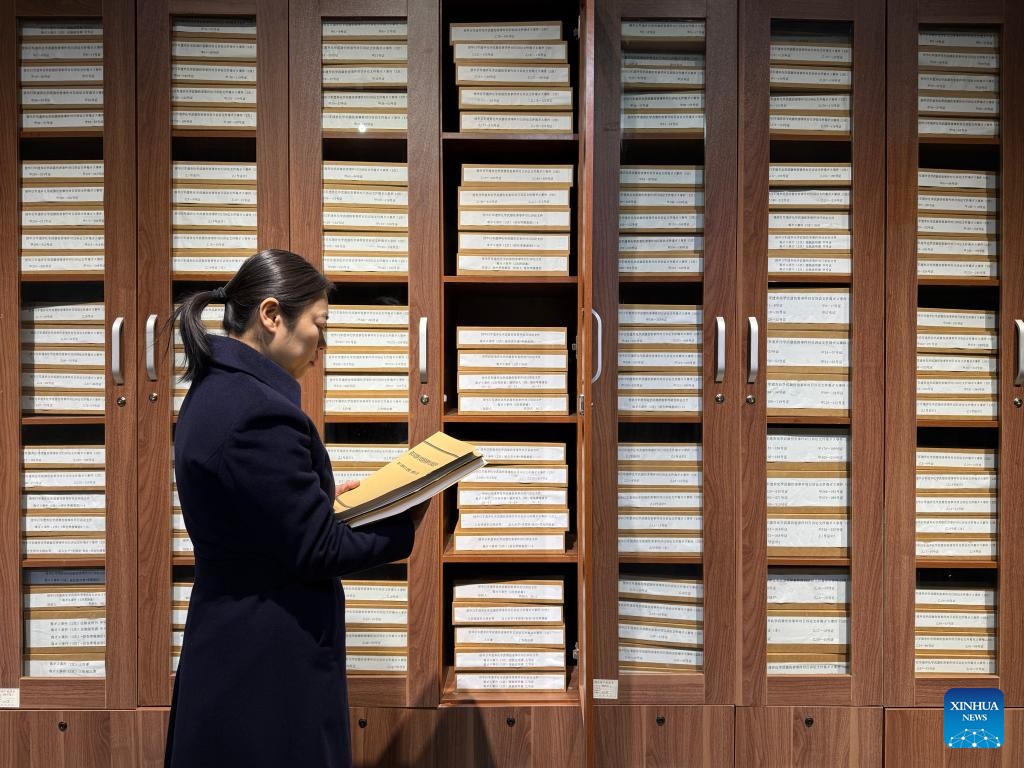 A researcher of the Exhibition Hall of Evidences of Crime Committed by Unit 731 of the Japanese Imperial Army arranges archives at the former site of Unit 731 in Harbin, northeast China's Heilongjiang Province, Dec. 12, 2024. The former site of the notorious Japanese germ warfare army, known as Unit 731, reopened to public on Friday with a special exhibition on cultural relics and historical materials of Japan's germ-warfare crimes in China.
