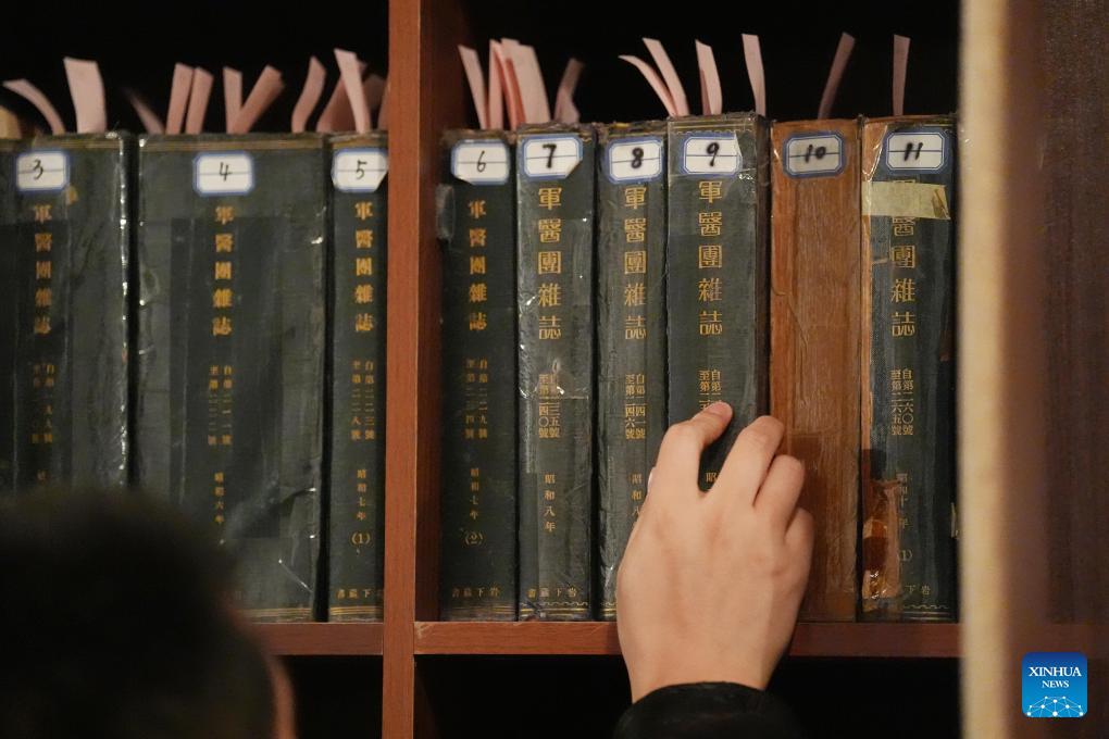 A researcher of the Exhibition Hall of Evidences of Crime Committed by Unit 731 of the Japanese Imperial Army arranges the original Japanese medical journals at the former site of Unit 731 in Harbin, northeast China's Heilongjiang Province, Dec. 12, 2024. The former site of the notorious Japanese germ warfare army, known as Unit 731, reopened to public on Friday with a special exhibition on cultural relics and historical materials of Japan's germ-warfare crimes in China.