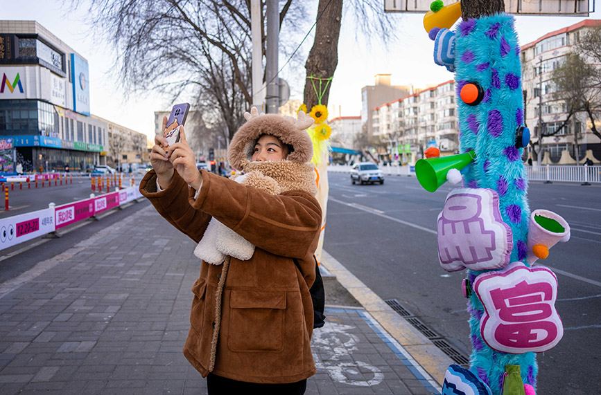 Photo taken on Dec. 9, 2024 shows a citizen taking photos with the trees "wearing" colorful sweaters at Kaide Square in Yuquan district, Hohhot city, north China's Inner Mongolia Autonomous Region. (Photo/Ding Genhou)