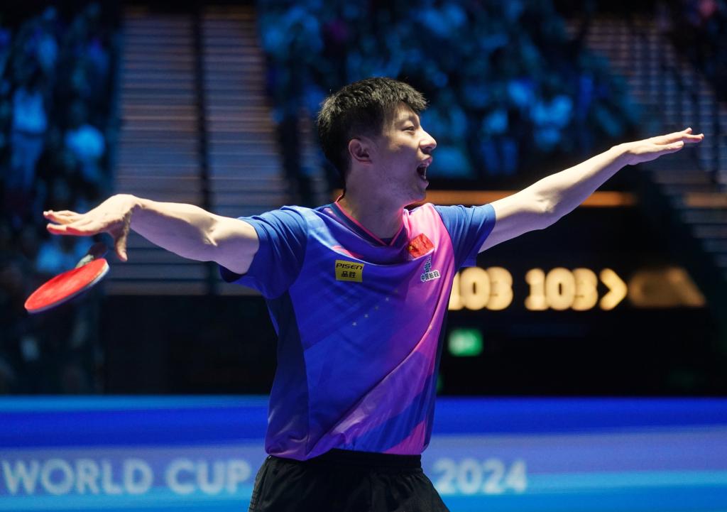 Ma Long of China celebrates after winning the men's singles final match against his teammate Lin Gaoyuan at the ITTF World Cup Macao 2024 at Galaxy Arena in Macao, China, April 21, 2024. (Xinhua/Wang Shen)
