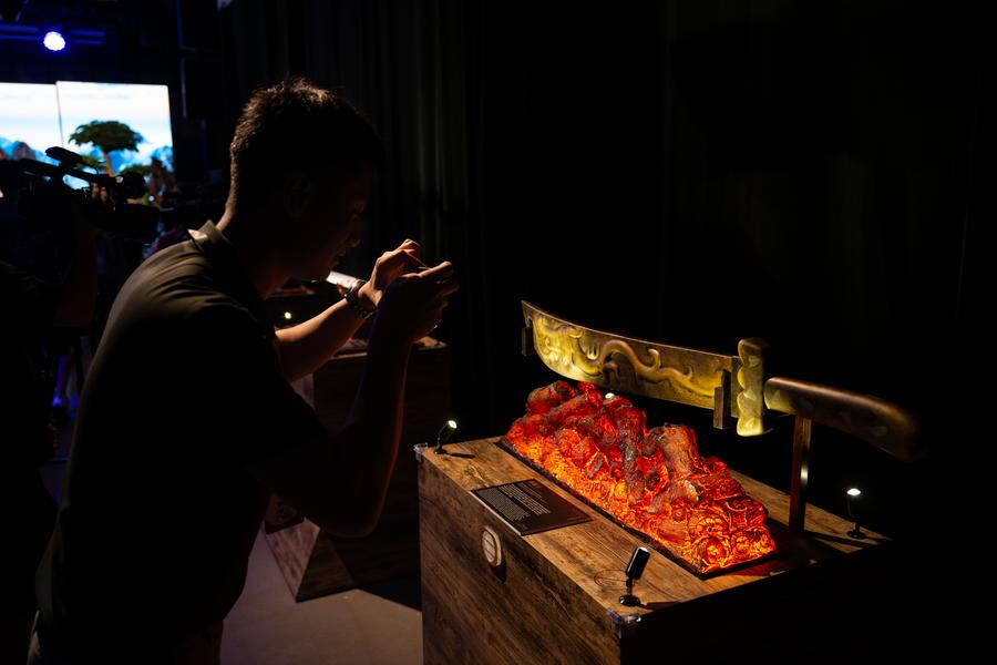 A visitor takes photos of an exhibit at the Jin Yong Wuxia Drama Costumes and Weapons Exhibition held in Macao, south China, May 14, 2024. (Xinhua/Cheong Kam Ka)