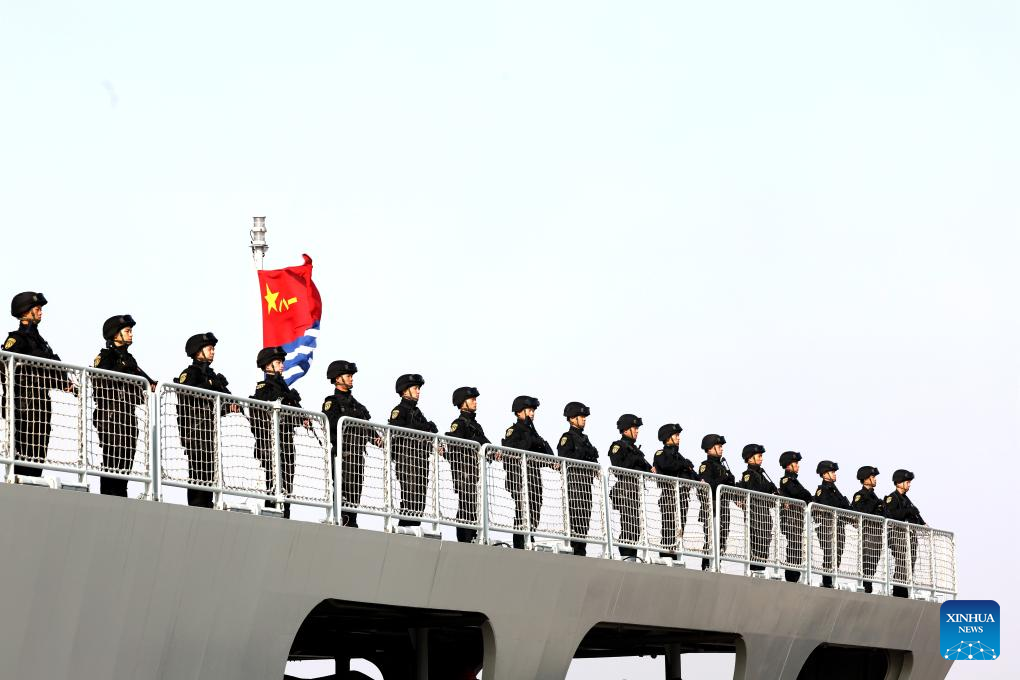 Chinese officers and soldiers stand in formation at a port in Zhoushan, east China's Zhejiang Province, Dec. 15, 2024. A new fleet of the Chinese People's Liberation Army Navy set sail from a military port in Zhoushan, east China's Zhejiang Province on Sunday to take over an escort mission from the previous fleet in the Gulf of Aden and the waters off Somalia. (Photo by Han Lin/Xinhua)