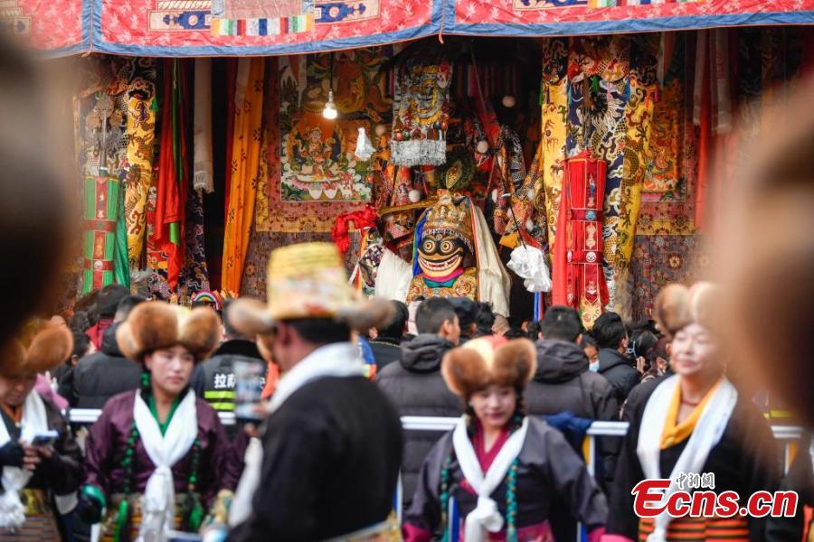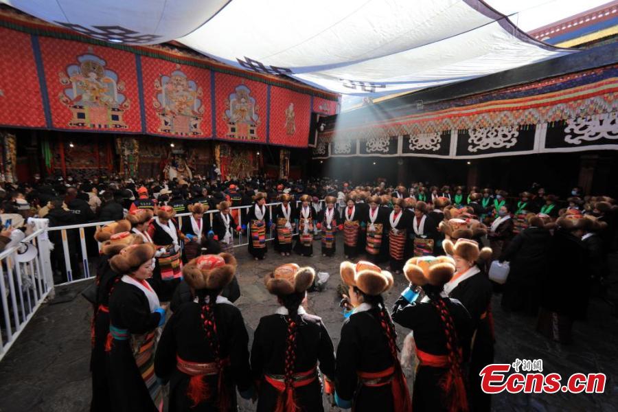 Women of the Tibetan ethnic group dance to celebrate the Fairy's Day celebration in front of the Jokhang Temple in Lhasa, southwest China's Xizang Autonomous Region, Dec. 15, 2024. (Photo/China News Service)