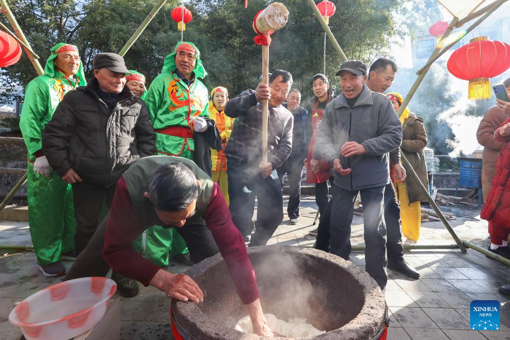 Villagers make dough for rice cakes during a folk festival in Houwu Village of Moganshan Town, Deqing County, east China's Zhejiang Province on Dec. 16, 2024. The folk festival was celebrated here on Monday with various activities to welcome the new year. (Photo by Yao Haixiang/Xinhua)