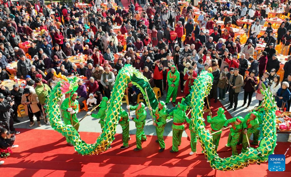 A drone photo taken on Dec. 16, 2024 shows villagers and tourists watching a dragon dance during a folk festival in Houwu Village of Moganshan Town, Deqing County, east China's Zhejiang Province. The folk festival was celebrated here on Monday with various activities to welcome the new year. (Photo by Xie Shangguo/Xinhua)
