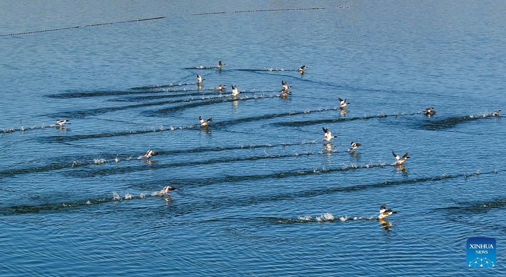 Migratory birds dance gracefully at lake in N China's Inner Mongolia