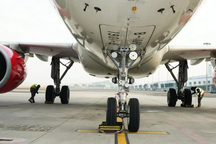Technicians carefully examine the tires of an aircraft. (Photo/He Pingjiang)