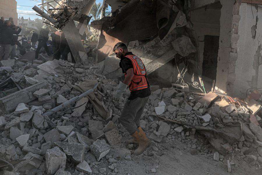 A member of Palestinian civil defense checks the destroyed municipality building following an Israeli airstrike in Deir al-Balah, central Gaza Strip, on Dec 14, 2024. . (Photo by Rizek Abdeljawad/Xinhua)