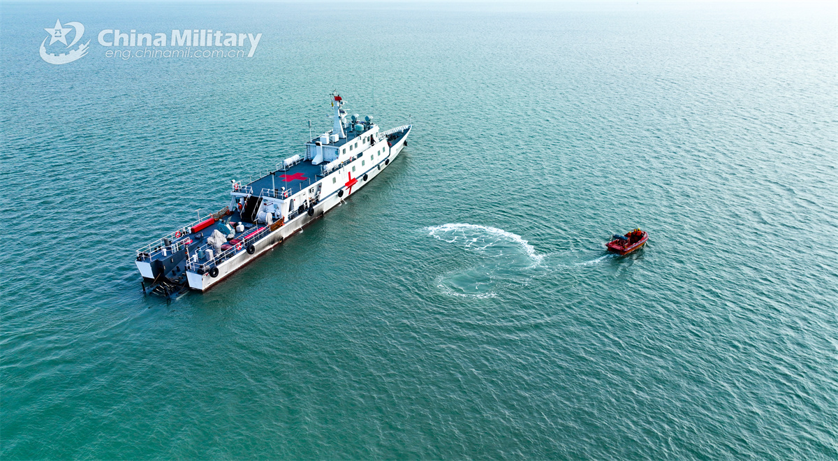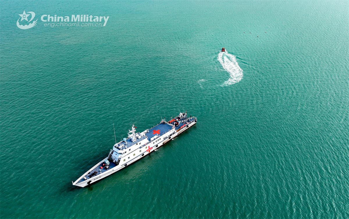 A hospital ship and a speed boat attached to a service ship group with the navy under the Chinese PLA Eastern Theater Command maneuver at sea during a maritime search and rescue training exercise in late November 2024. (eng.chinamil.com.cn/Photo by Chu Chengtao)