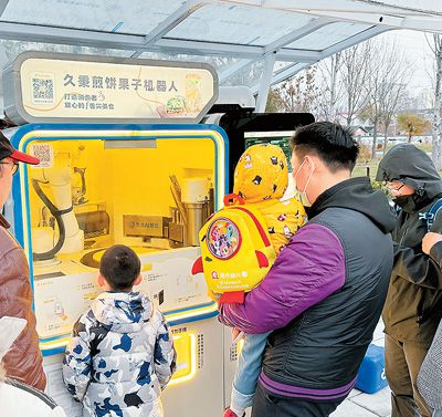 A robot makes Jianbingguozi, or pancakes rolled with a crisp fritter, in a park in Beijing. (Photo courtesy of the interviewee)