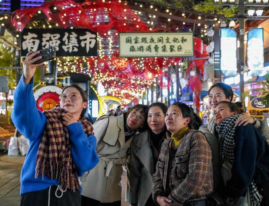 Tourists pose for a photo on a street at night in Kunming City, southwest China's Yunnan Province, Dec. 6, 2024. (Xinhua/Wang Jingyi)