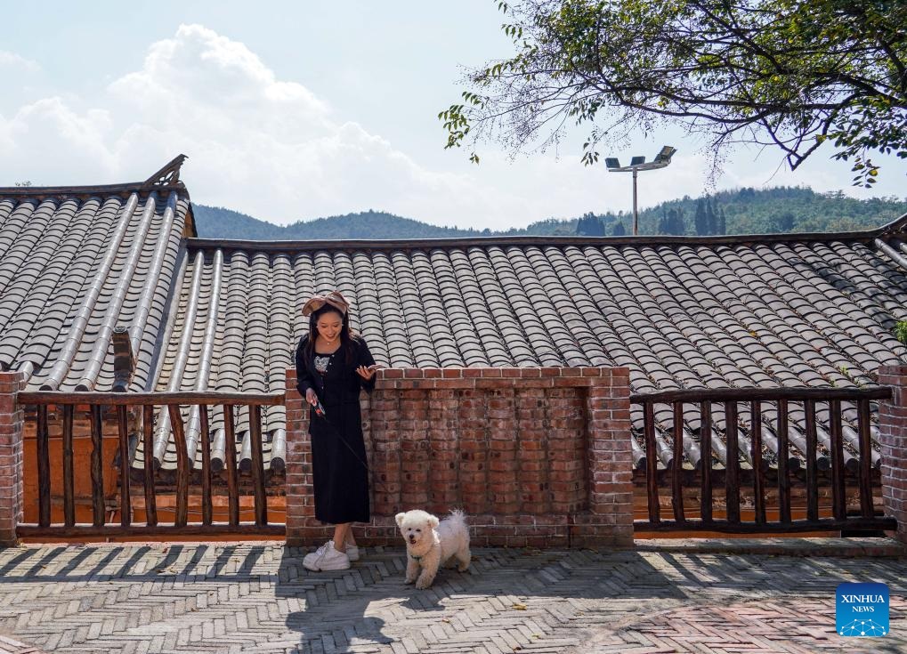 A sojourner walks a dog at Tuguachong Village, Qujing City, southwest China's Yunnan Province, Oct. 30, 2024. (Xinhua/Wang Jingyi)