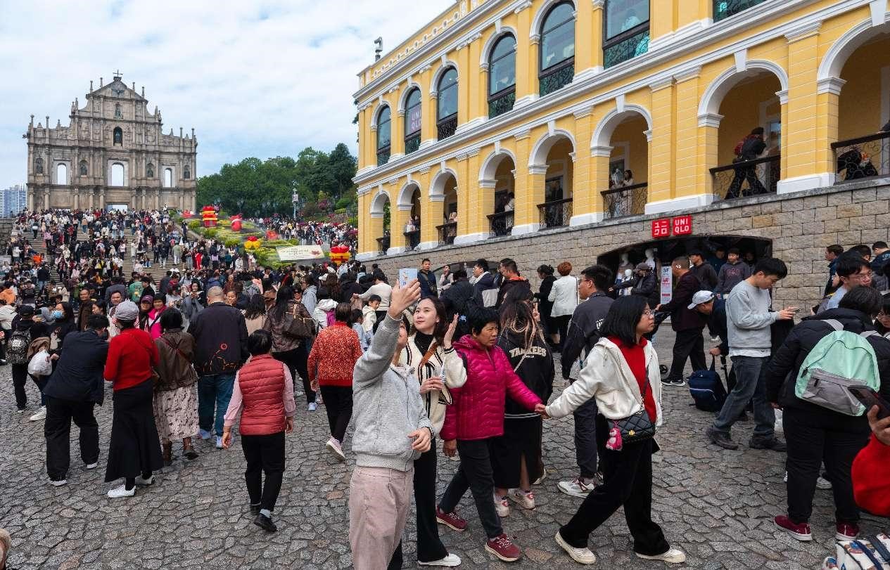 Photo taken on Dec. 14, 2024 shows tourists flocking to the Ruins of St. Paul's, a landmark in Macao. (People's Daily Online/Liang Jianqing)