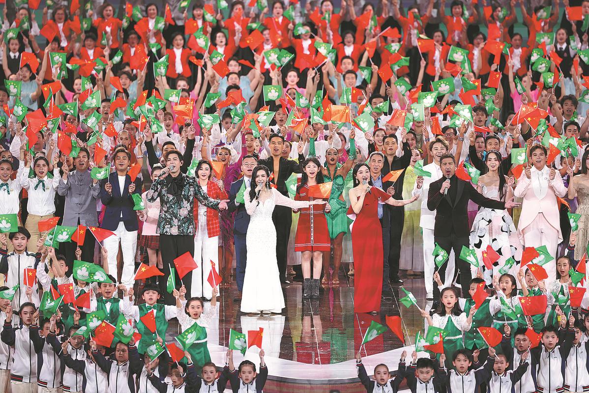 Performers sing and dance on Thursday at the Macao East Asian Games Dome during a gala marking the 25th anniversary of Macao's return to the motherland. (Feng Yongbin/China Daily)