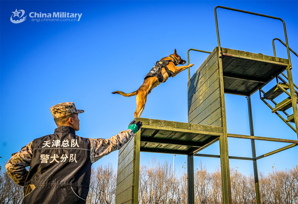 A military dog assigned to the Chinese People's Armed Police Force (PAP) Tianjin Corps jumps up an obstacle during a multi-subject training exercise on December 9, 2024. (eng.chinamil.com.cn/Photo by Gong Xu)