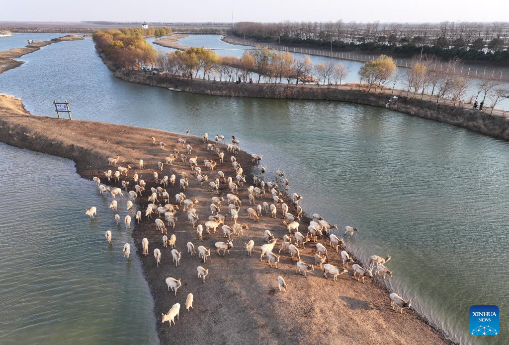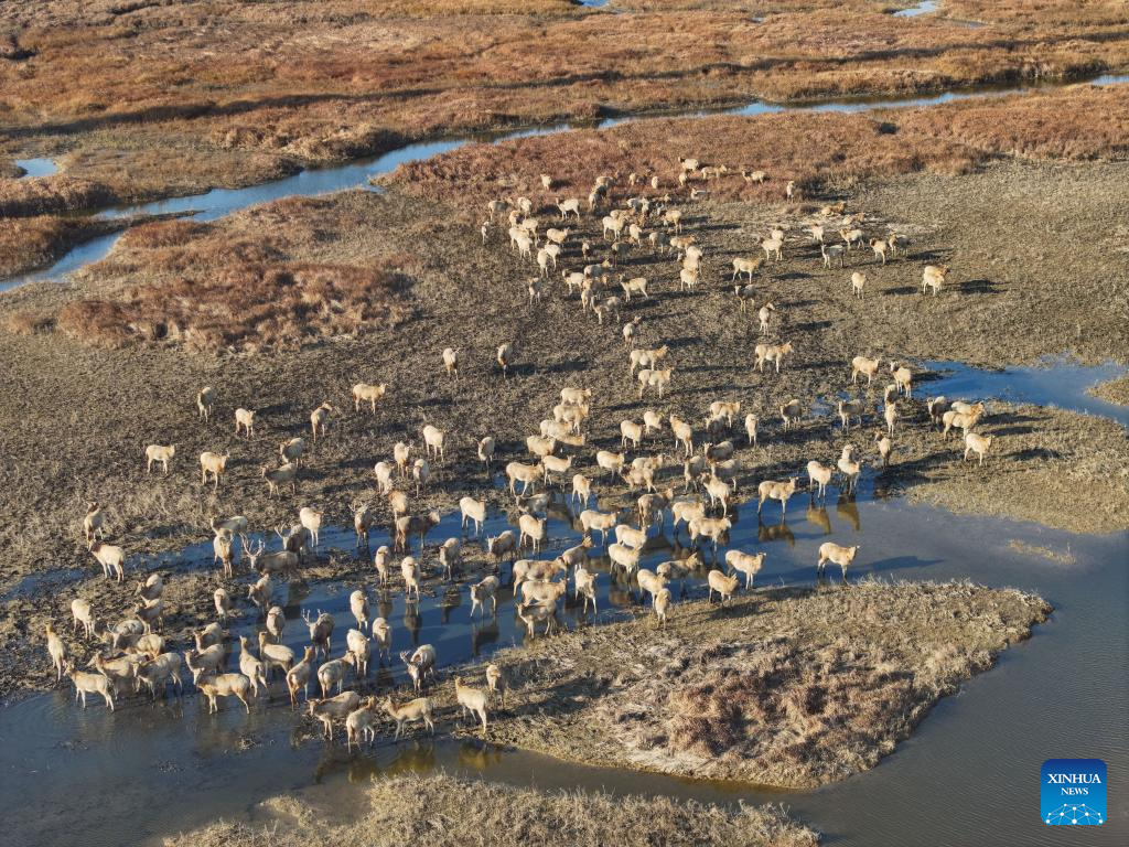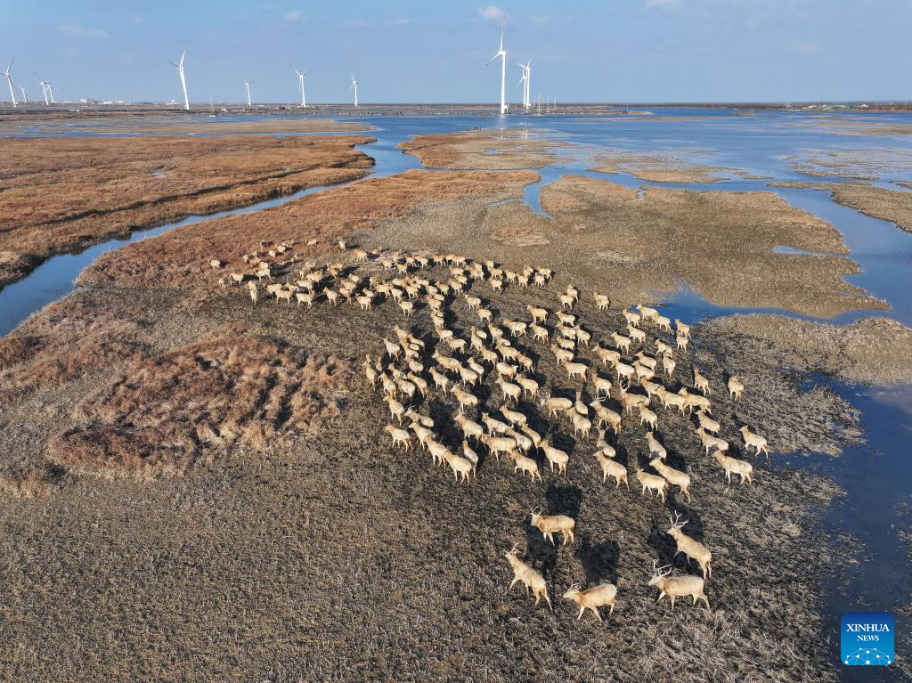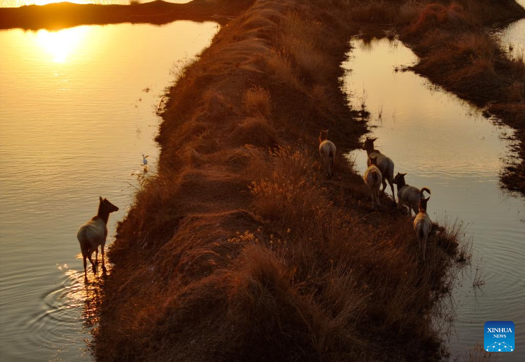 An aerial drone photo taken on Dec. 21, 2024 shows elks in Dafeng District of Yancheng City, east China's Jiangsu Province. The population of elks here has maintained a stable growth over years as the ecological environment in Dafeng District continues to improve. (Xinhua/Ji Chunpeng)